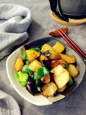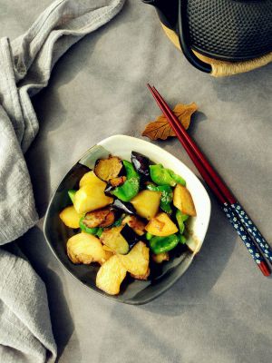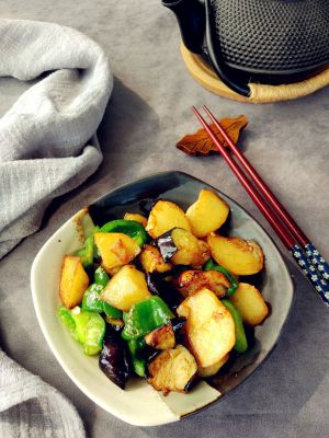 土豆洗净去皮,和青椒、茄子一起切滚刀块。茄子入150°油温,炸至金黄,捞出沥净水分备用
