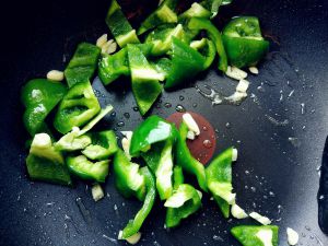 热锅热油,爆香蒜碎,下青椒炒至断生