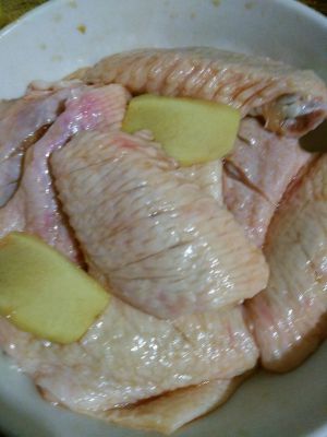 鸡翅正反两面切口三条姜切成丝柠檬切四片左右腌制鸡翅(冷冻的鸡翅不用焯水直接腌制)半个小时即可