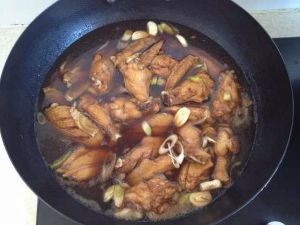 倒入可乐,生抽,放入葱段,姜,八角,如果觉得颜色浅,可以稍微加点老抽。大火烧开后,小火炖十五分钟。
