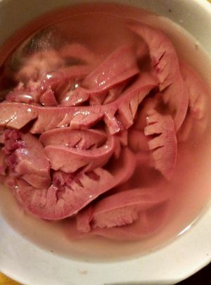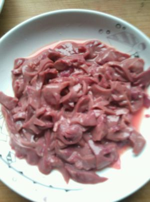 猪腰子喊老板儿帮你把腰骚去掉,切成花刀,加葱姜水泡个10分钟,把血水泡出来,再取出姜葱,把血水倒掉