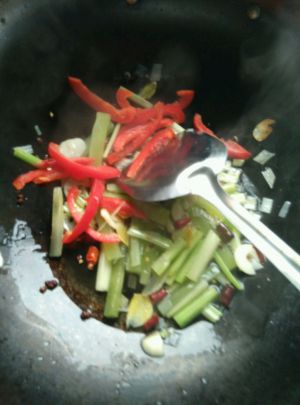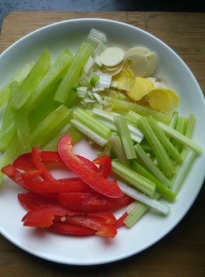 将红椒.青笋.西芹切丝.生姜,大蒜切片.干海椒切节。