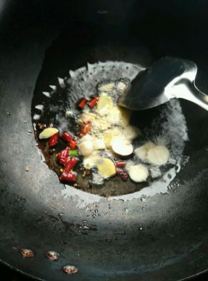 锅入油下干红椒.花椒.姜.蒜爆香\。