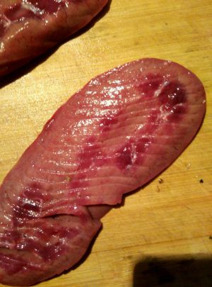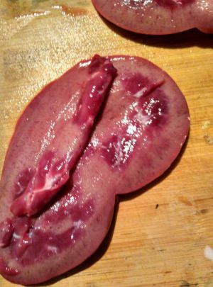 猪腰撕去外膜.从中间切开.片去腰臊.一定要清理干净。
