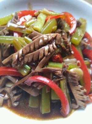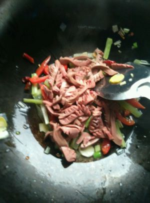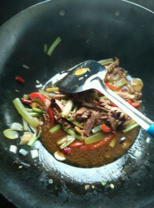起锅烧油,油温6成(看到锅开始微微冒烟)下腰花,炒到翻白的时候,把大葱花椒泡椒段姜蒜片下锅一起翻炒,炒到料香味出来,下莴笋段和木耳,稍微翻炒两下,赶快把那个碗里面的汁倒进去,再炒半分钟不到,关火