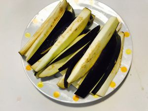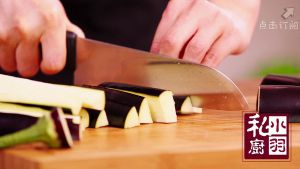 ▲把茄子洗净去头去蒂,切成手指粗细的长条。