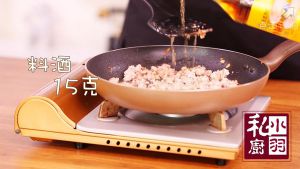 ▲等看到肉馅的颜色变白了,倒1大勺的料酒继续翻炒,取出肉腥味,等看到肉馅没有红色的了,就可以出来备用了。