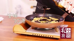 ▲等看到茄子变软了,倒入2大勺的生抽、半勺的老抽、炒匀。