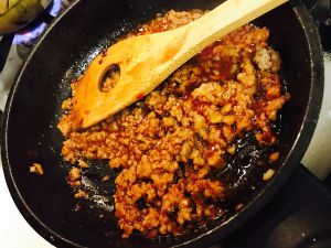 ▲炒锅烧热倒油,放入葱煎蒜末炒出香味,然后把肉馅倒进去继续翻炒。