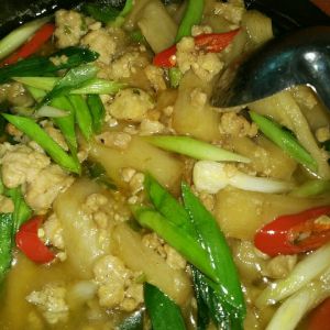 将炸完的油倒出来留少量炒肉末,煸炒出香味,肉末打散(喜欢辣的可以此时加入辣椒)倒入茄子,加水熬煮茄子入味,加适量盐(酱油和耗油本身有咸味,可以试过再加盐)