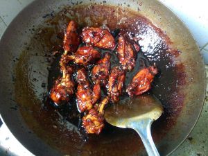 不用放油,大火煎鸡翅,两面金黄后加入可乐加入少许酱油,大火煮开后转中火煮15分钟,最后5分钟放入黄糖,煮至汤汁浓稠