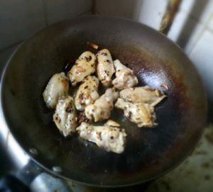 锅里放入油,七成热,把鸡翅煎至两面焦黄,小心油贱出来,烫伤。