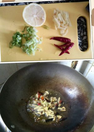 葱(留出小半最后用),姜,蒜,朝天椒放入油中炒香。柠檬备用。