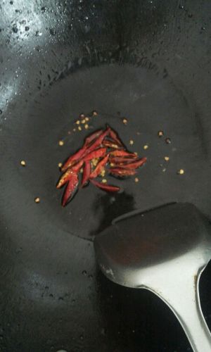 锅里水分干了放油下去,接着把辣椒也放下去爆炒一下