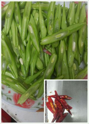 1.四季豆洗净,切段。 2.锅放多点油,盖过四季豆的量,煸到豆有点皱纹就可以了, 3.滤油捞起, 4.锅底的油倒出来留一小部分, 5.将备用的姜,辣椒,蒜末下锅到微香,注意不要焦了~, 6.倒入煸好的四季豆翻炒, 7.加入生抽,老抽,盐