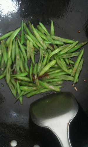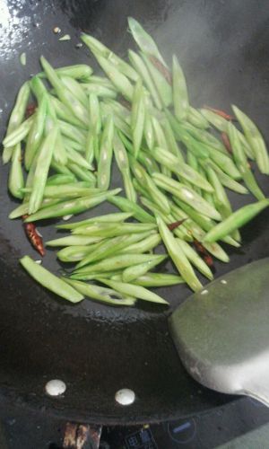 四季豆颜色变了就放盐,下去继续爆炒,起锅前加点鸡精粉调味即可