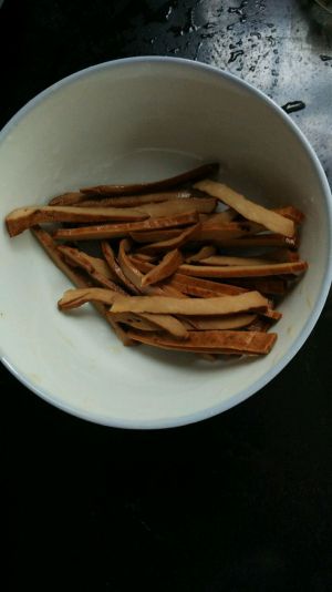 下油锅,爆香少许蒜头。下胡萝卜丝先油锅炸透。