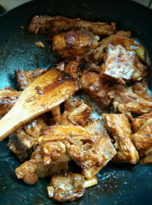 黄豆酱炒香后加入焯好的排骨一起炒。烹入一勺酱油两勺料酒。大火