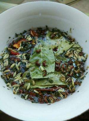 花椒 香叶 小茴香 桂皮 茶叶 山楂干清水洗净,用一次性茶包装好。