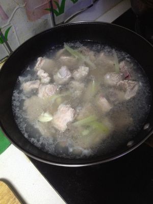 排骨冷水下锅,放葱姜料酒焯水,开锅倒出洗净
