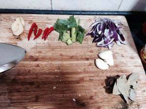 准备辅料,大蒜、香叶、蒜青、姜片、红辣椒、八角、洋葱