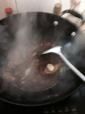倒入老抽上色,加葱姜蒜,香叶,桂皮,八角