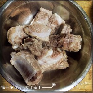 排骨洗净,净泡30分钟,连同凉水一起下锅烧开,去除血沫,捞出沥干备用