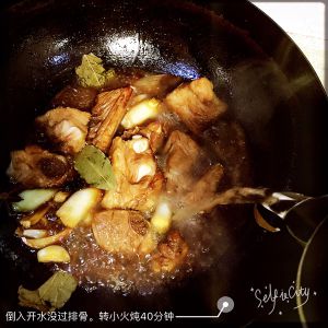 加入清水,没过排骨。加入八角,香叶。大火烧开,转中火。烧至收汁。