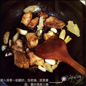 将排骨倒入继续翻炒,放四勺白砂糖、生抽、红烧酱油继续翻炒!待排骨变色,将之前压力锅内的排骨汤倒入炒锅中,没过排骨即可!加入几片香叶和八角翻炒一会,水沸腾,盖上锅盖转中火,焖10分钟左右,因已压过排骨已经酥软,时间不需很长