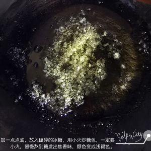 锅里加一点点油,放入碾碎的冰糖,用小火炒糖色,一定要小火,慢慢熬到糖发出焦香味,颜色变成浅褐色。