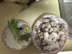 捞出排骨块用开水冲一下,注意不要用凉水,否则肉会发硬