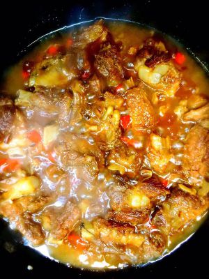 将肋排放入炒好的糖色中快速翻炒、一定要快!使每块排骨都能粘上糖衣、然后放味极鲜、鲜红椒调味上色、添加热水、中火熬30分钟、熬到肉松软、大火收汁