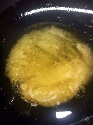 油加热放白糖、小火炒糖色、一定要小火!熬到白糖融化至金黄