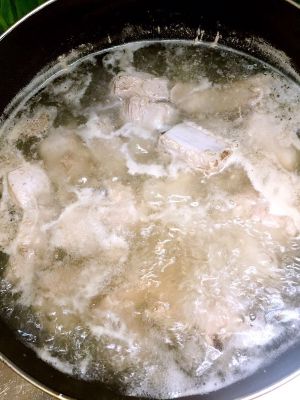 凉水和排骨一起倒入锅中煮至沸腾、去除血沫和肉腥味