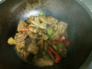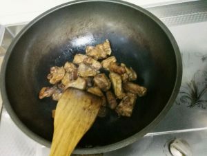 倒入备好的肋排,加适量料酒酱油,中火翻炒约一分钟。
