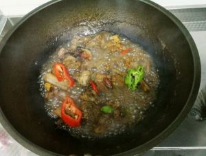 加水大火煮沸,放入冰糖、干辣椒以及一部分青红辣椒继续煮入味,中火煮约15分钟。 加半碗凉水,加入剩下的辣椒丝,转小火煮约10-15分钟。
