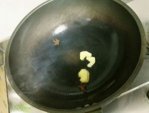 放入生抽继续加色至深红色,放入生姜,葱段炒香,然后加入适量水没过排骨