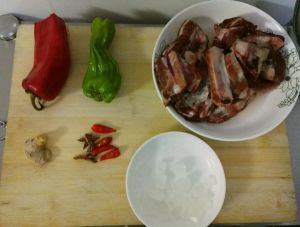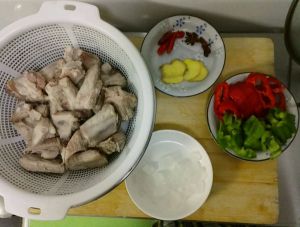 肋排焯水,冲去浮沫,沥干备用,辣椒切丝,生姜切片备用。