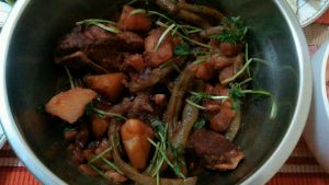 4.水烧开后倒入土豆和豆角,根据实际情况可再加适量调味料,中火炖30分钟