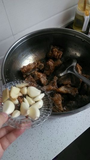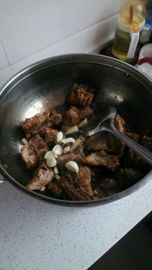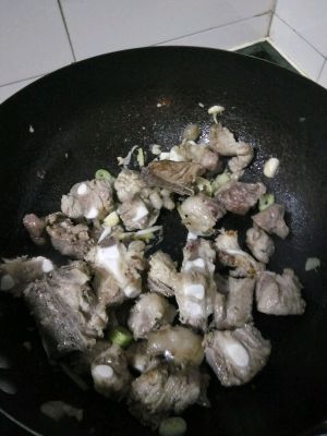 把小排放入锅里,翻炒把糖挂到肉上,放葱姜蒜翻炒借味。