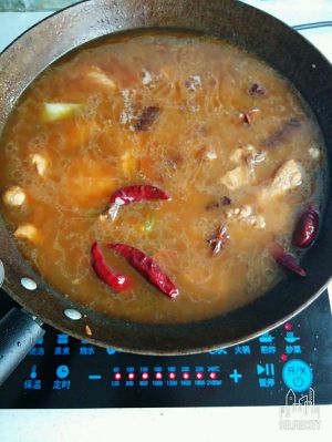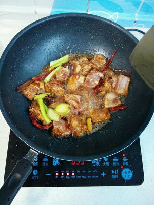 等糖成焦糖色,泡沫最多的时候倒入排骨,翻炒均匀,再倒入葱姜八角桂皮辣椒和料酒,翻炒5分钟。