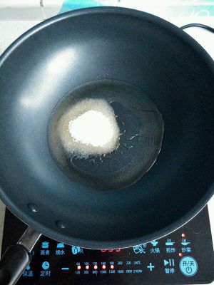 冷锅凉油放入3勺白糖,中火,不停的用铲子搅动,以免糖受热不均匀烧糊了。