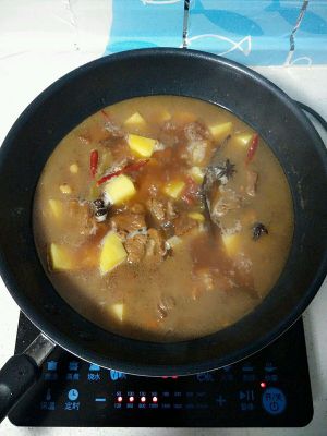 再炖大约20分钟,汤汁收干,土豆熟烂就可以出锅了,排骨是红色的,好吃又好看。