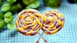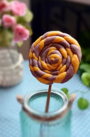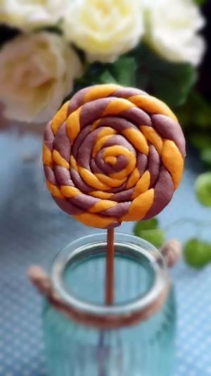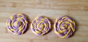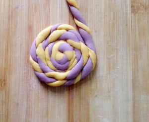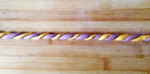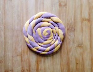 然后分别取一小部分搓成长条状,之后把两个不同颜色的长条互相缠绕扭结。
