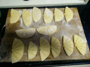 对折,用干净的梳子压出花纹,并在底部揪出根蒂状