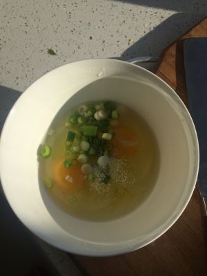 馒头切片,葱切末,鸡蛋打在碗里放盐、鸡精少许