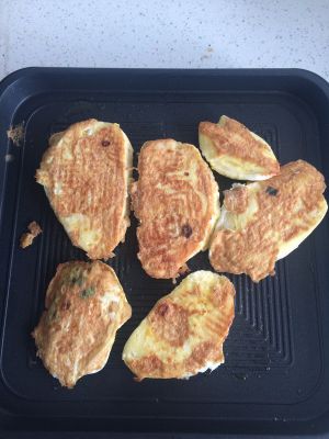电饼铛预热好了,把蘸过鸡蛋液的馒头片放在锅内,静等
