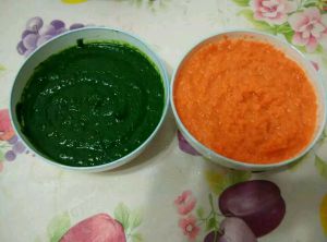 首先把菠菜汁胡萝卜汁打好放在碗里