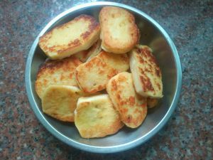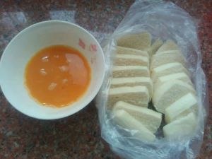 两只蛋打成蛋液加少许盐,馒头切片,1cm厚度