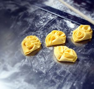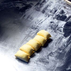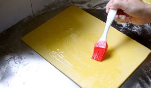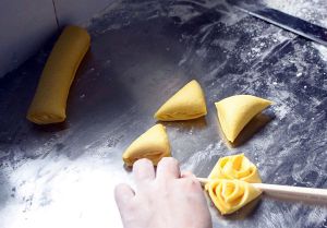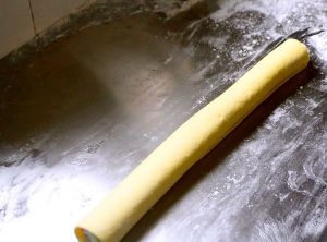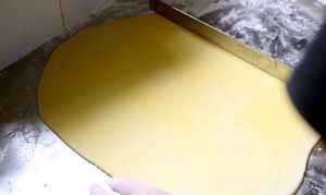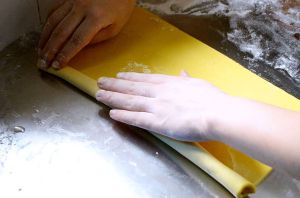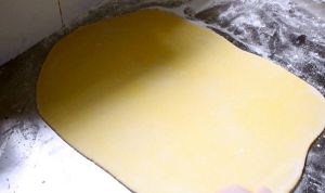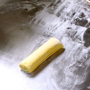 把面团揉圆按扁,用擀面杖擀成厚薄均匀的长方形大面片。